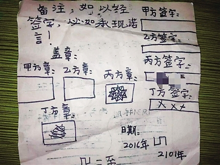 记者看到,这份合同规定由甲乙丙丁四方签署,分别代表父、母、小雪和未来的弟弟或妹妹。条款规定大致如下:1.生了二胎以后(无论男女、龙凤、双胞胎),甲方乙方不可偏心丁方,要以从前那种态度对待丙方。2.不可以丁方太小或经济不宽裕为由,克扣丙丁双方的吃穿用度。该条款下具体拟定了衣服、喝奶和饮食要求,如丁方每月3件衣服,每天必须喝奶,哭了爸妈必须安抚;自己作为丙方,每月2件裙子,饭食饮水不可少一件,自己可以照顾弟妹,不可偏心。以上条款经过签字,必须兑现承诺。合同期限为2016年~2101年。甲乙丙丁四方分别留有签字、盖章的空格,其中丙方的签字和盖章(图画)已签署完毕。