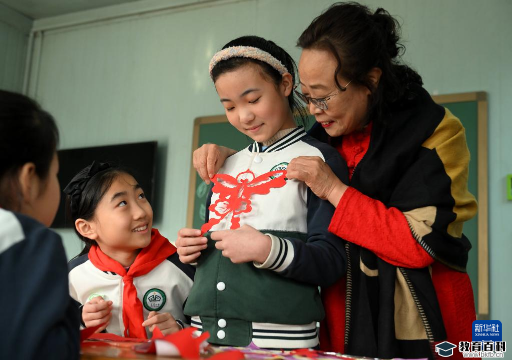 2月28日,国家级非遗蔚县剪纸代表性传承人周淑英(右一)在石家庄市东风小学非遗工坊给学生展示剪纸作品。